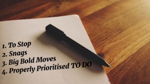 4. Drawing on what you’ve learned from the first three lists, a TO DO list properly prioritised for results (often meaning most uncomfortable first)